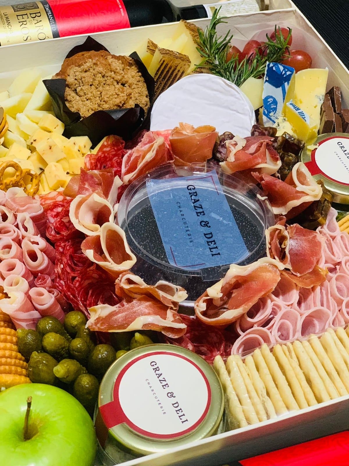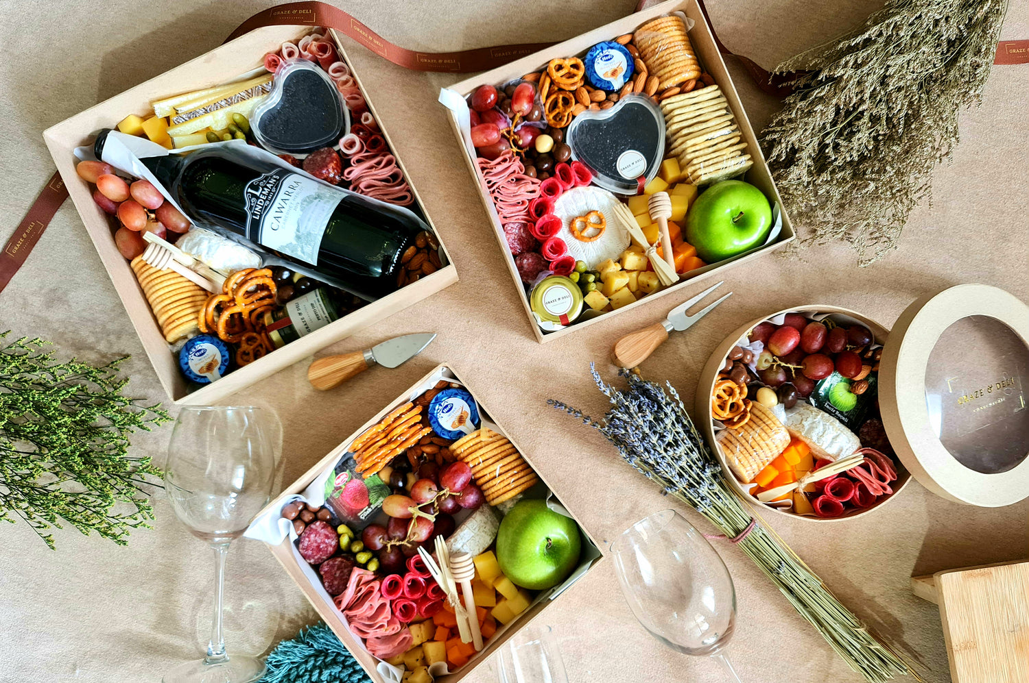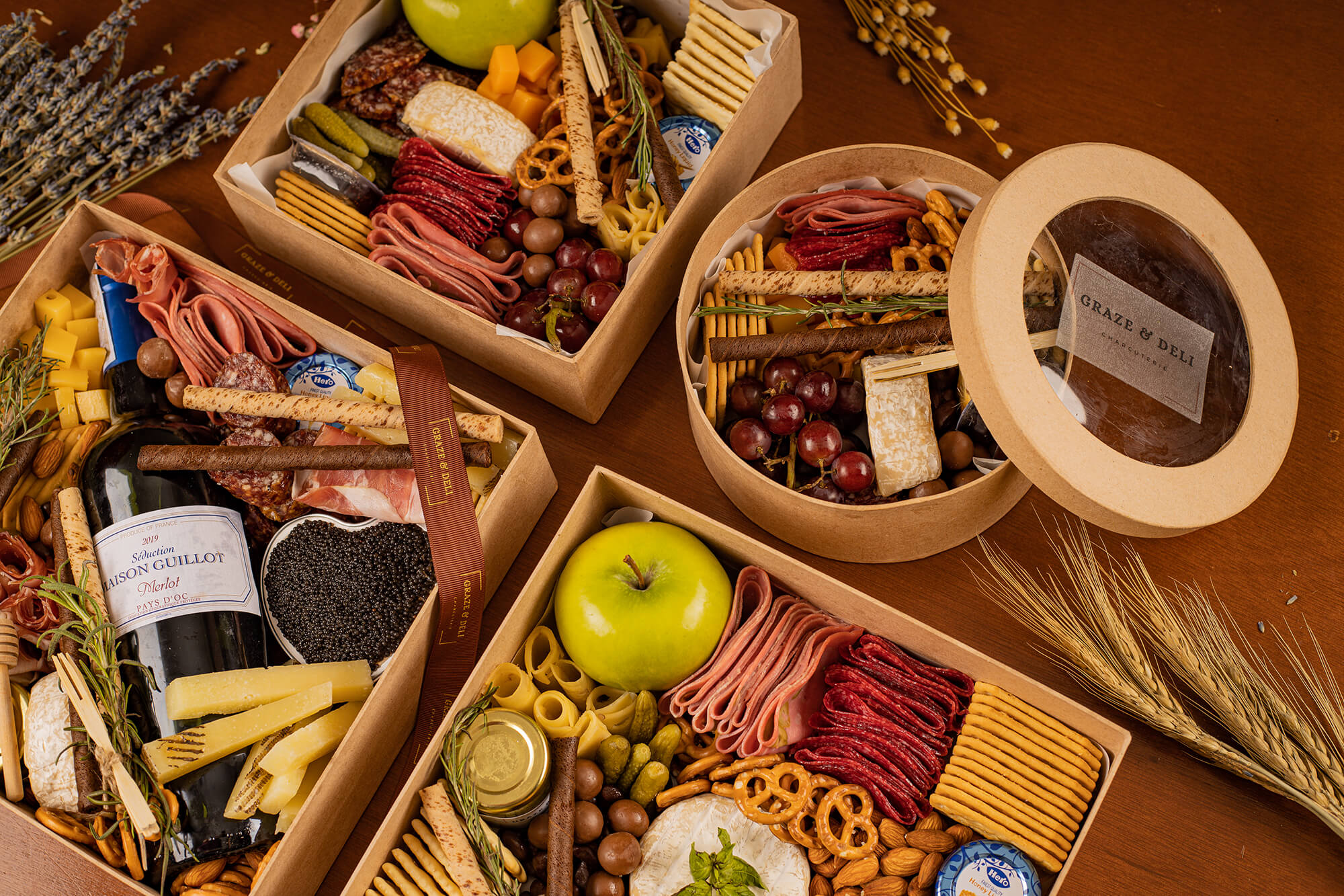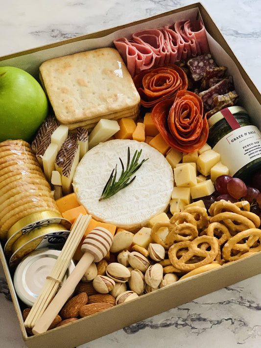 Curated Graze and Deli boxes filled with artisan cheese and cured meat